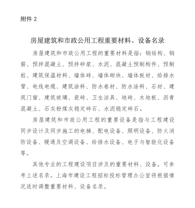 二、應(yīng)通過(guò)招投標(biāo)平臺(tái)進(jìn)行招標(biāo)的材料包括重要的結(jié)構(gòu)性建筑材料和功能性材料,設(shè)備包括電氣、消防、暖通、給排水、弱電等專業(yè)工程相關(guān)設(shè)備,詳見(jiàn)附件2。